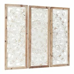 Bring farmhouse charm to your space with this three-panel wall decor. Each piece features intricate carvings that create a continuous floral motif across all three panels. This rustic statement piece is a gorgeous way to pull traditional and country-cottage-style rooms together.