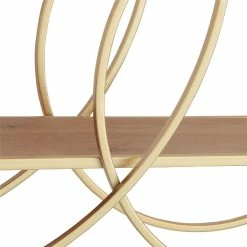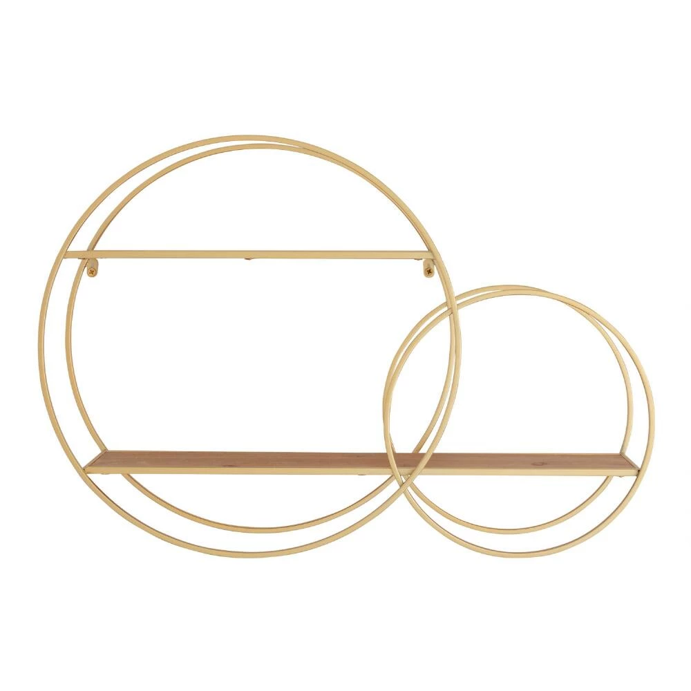 With a silhouette that takes its inspiration from the lunar eclipse, our round wall shelf features overlapping gold rings and two tiers of wood shelving. This modern wall storage creates a chic display of framed photos, trinkets and small houseplants.